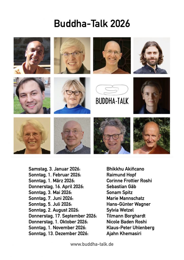 Die Buddha-Talk-Reihe lädt auch 2026 wieder zu einer vielfältigen, offenen und traditionsübergreifenden Auseinandersetzung mit dem Buddhismus ein. In monatlich stattfindenden Online-Vorträgen und Gesprächen präsentieren erfahrene Lehrer:innen, Praktizierende und Autor:innen Einsichten aus verschiedenen buddhistischen Richtungen – von klassischen Lehrtexten über Meditation und Achtsamkeit bis hin zu zeitgemäßen Fragestellungen des Buddhismus im Alltag. Jede Veranstaltung bietet die Gelegenheit, den Dharma – die zeitlose Lehre des Buddha – in inspirierenden Vorträgen, Reflexionen und gemeinsamen Meditationen zu erleben und zu vertiefen. Die Teilnahme ist offen für alle Interessierten, unabhängig von Vorkenntnissen oder spiritueller Zugehörigkeit. Weitere Informatoinen und Anmeldung zu den Veranstaltungen unter: https://www.buddha-talk.de/